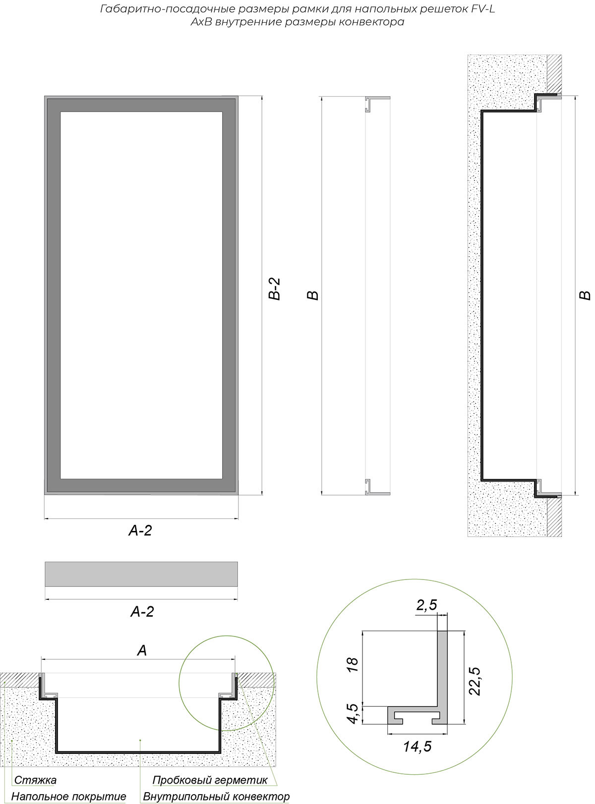 L-образный профиль монтируется встык с напольным покрытием. Зазор между рамкой и напольным покрытием заполняют пробковым герметиком. Обеспечивает высокую жесткость корпуса конвектора.