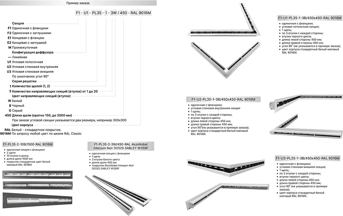 Как и все щелевые решетки, диффузор PL35 изготавливается в виде угловой секции для установки вентиляционной системы по всему периметру помещения.