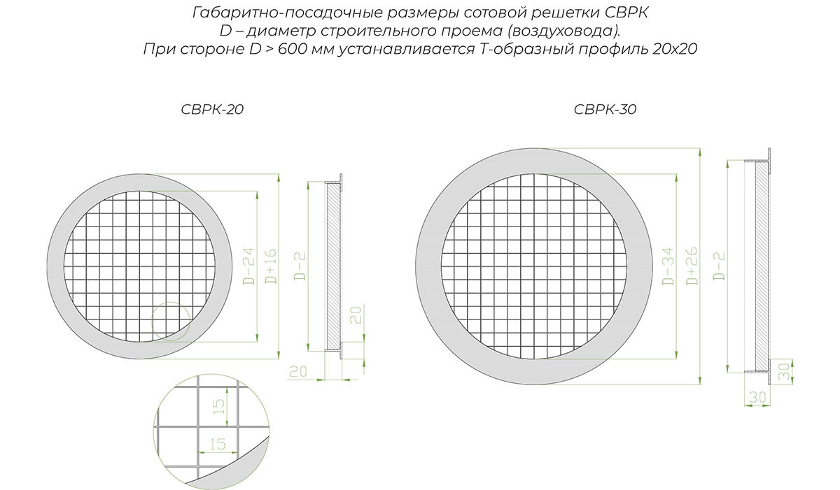 Решетки СВРК изготовлены из круглой рамки и ячеистой вставки с квадратными ячейками 15х15 мм. Особенностью данной модели перед решетками других видов является легкий вес изделия и повышенный коэффициент живого сечения, за счет ячеек, сделанных из тонкого листа алюминия. Ширина фланца может быть 20, 30 или 40 мм.